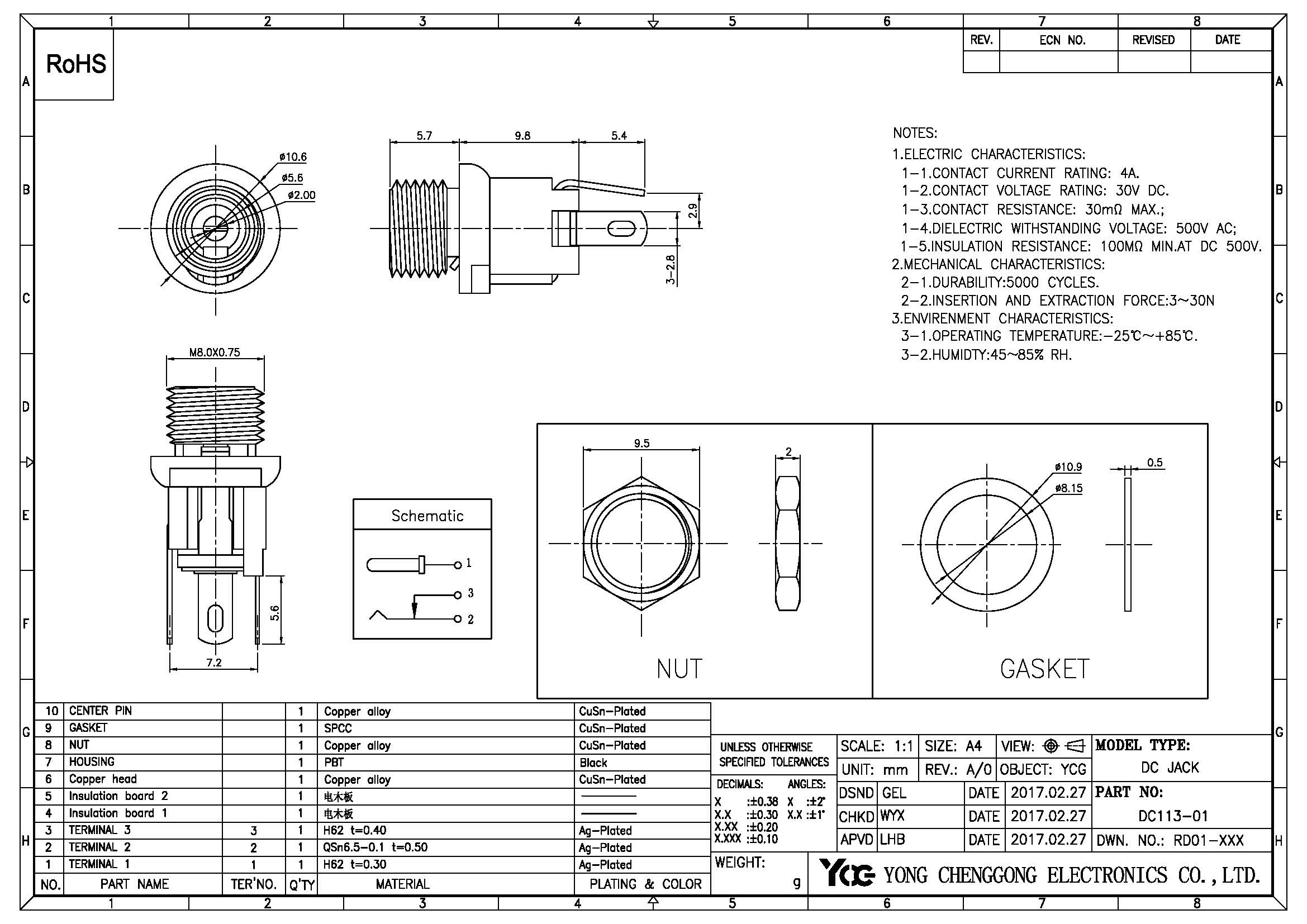 DC POWER JACK,2.00mm V/D H9.80mm, WITH NUT M8.0*0.75