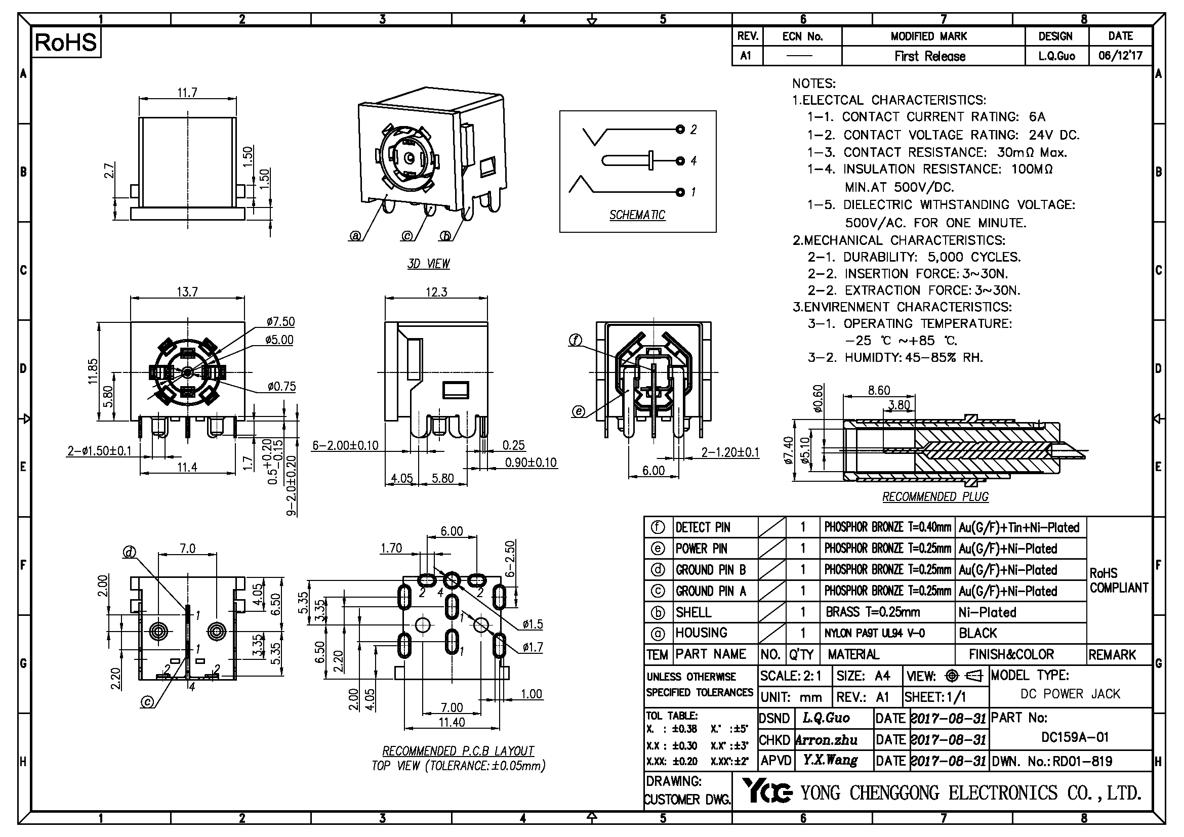 DC POWER JACK,φ0.75mm, R/A DIP WITH SHELL