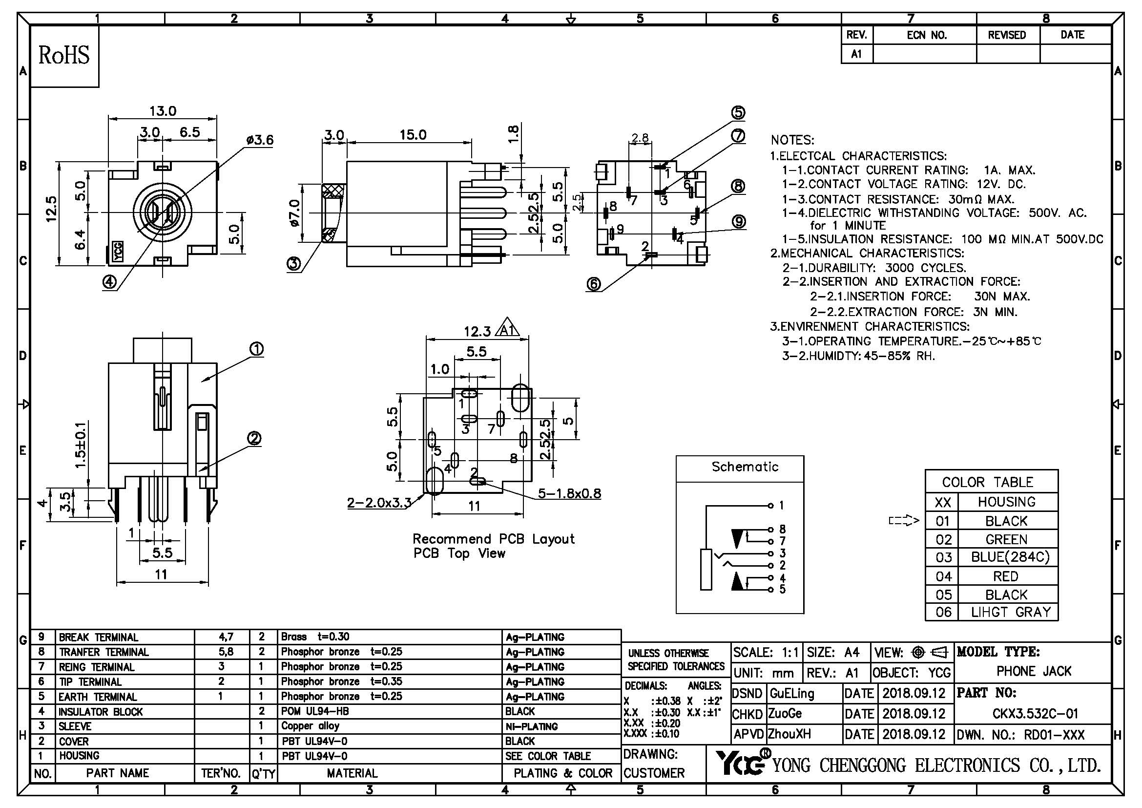 PHONE JACK φ3.6mm,V/D,4 Poles DIP,BLACK&GREEN&BLUE&RED&LIGHT GRAY