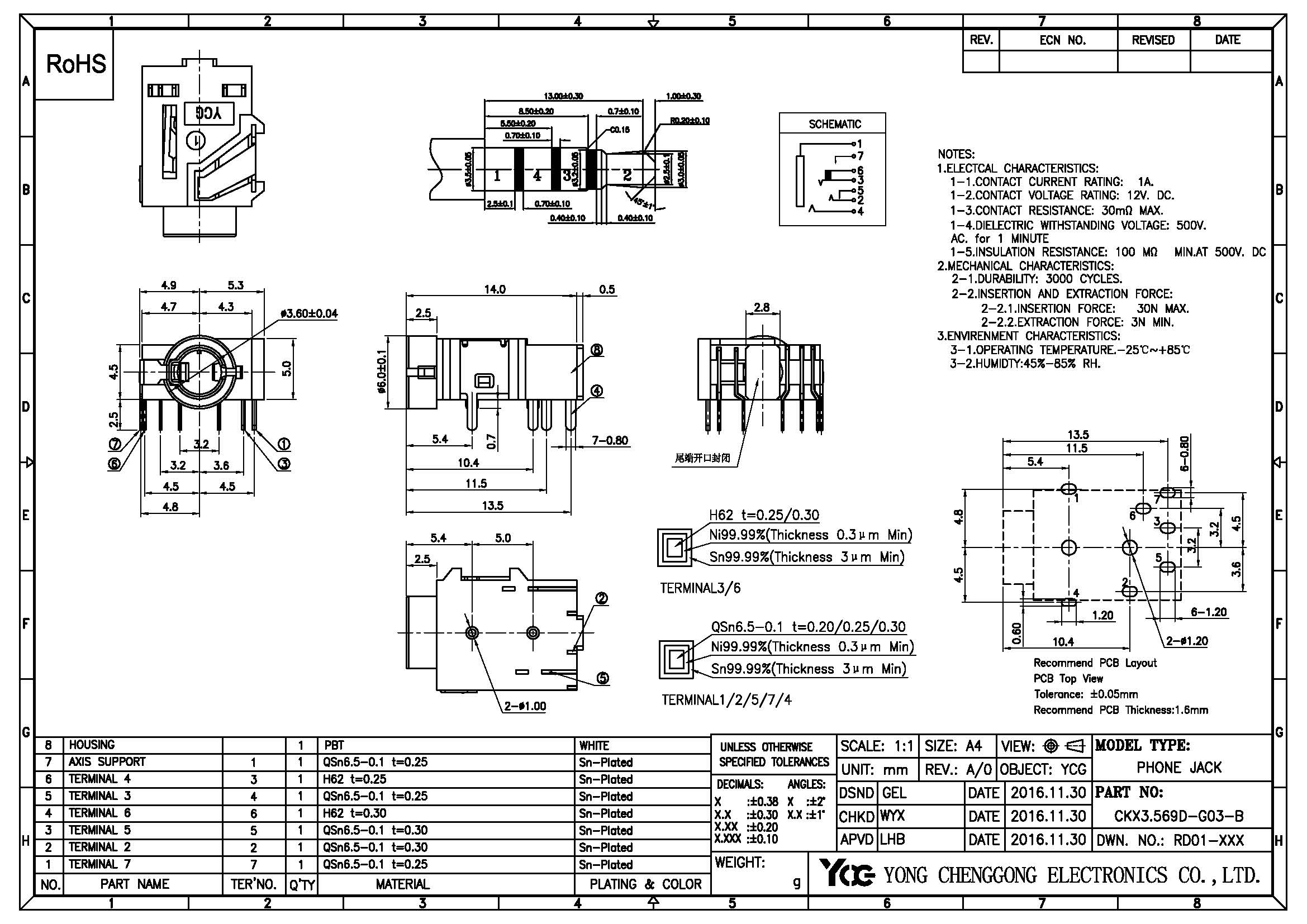 PHONE JACK φ3.6mm,R/D,CH2.25mm,4 Poles,BLACK