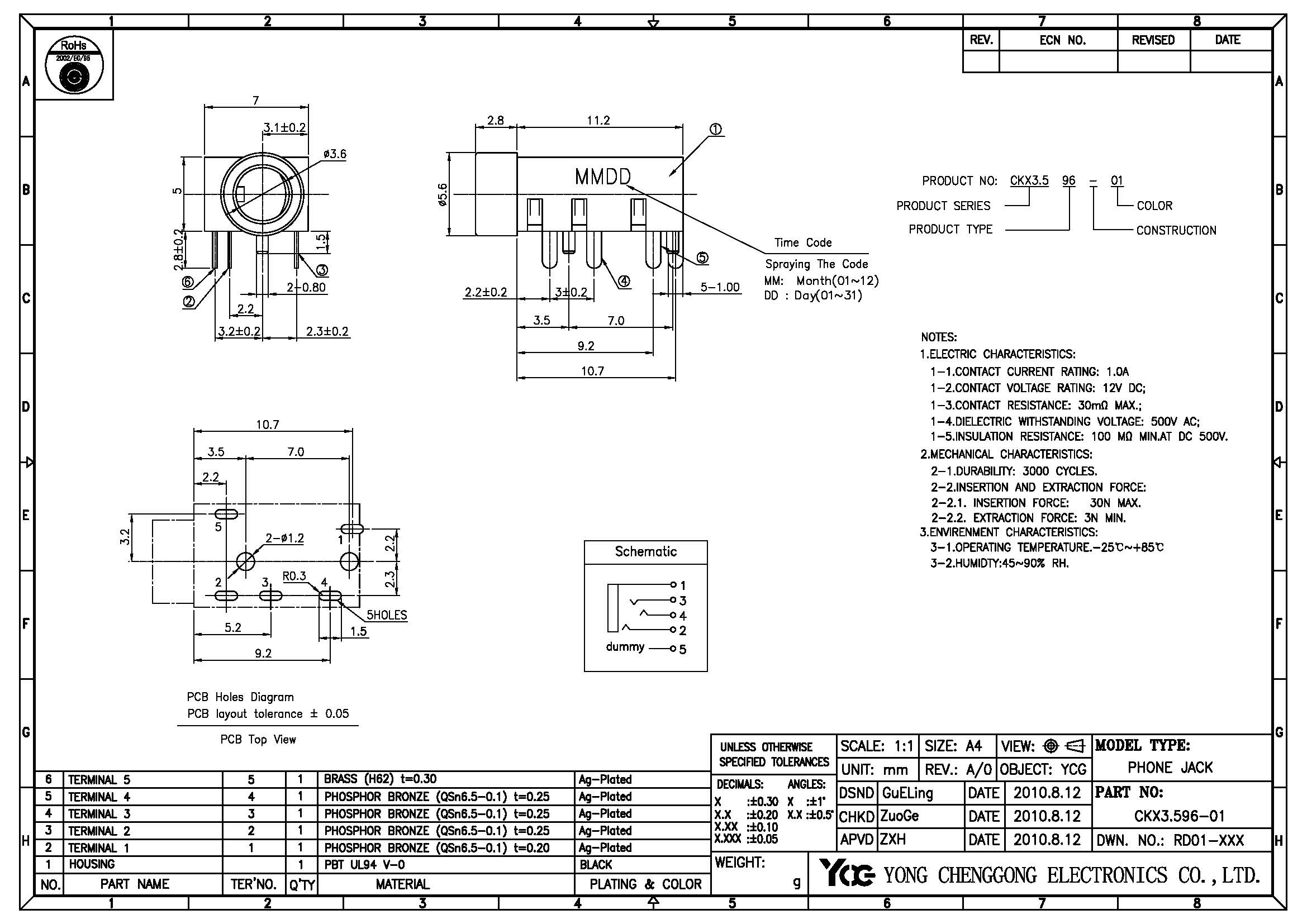 PHONE JACK φ3.6mm,R/D,CH9.60mm,4 Poles,BLACK