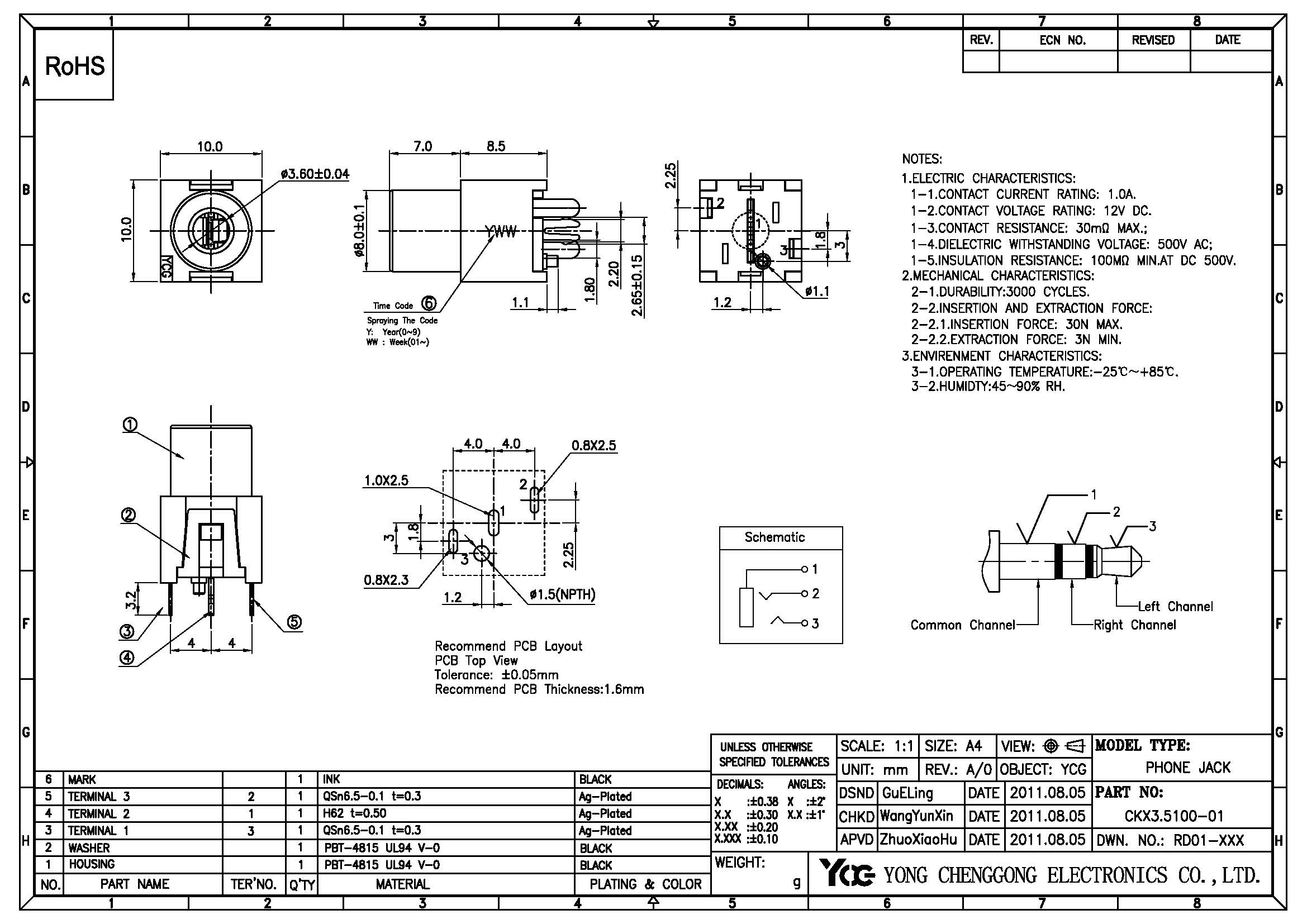 PHONE JACK φ3.6mm,V/D,H8.5mm,3 Poles,BLACK