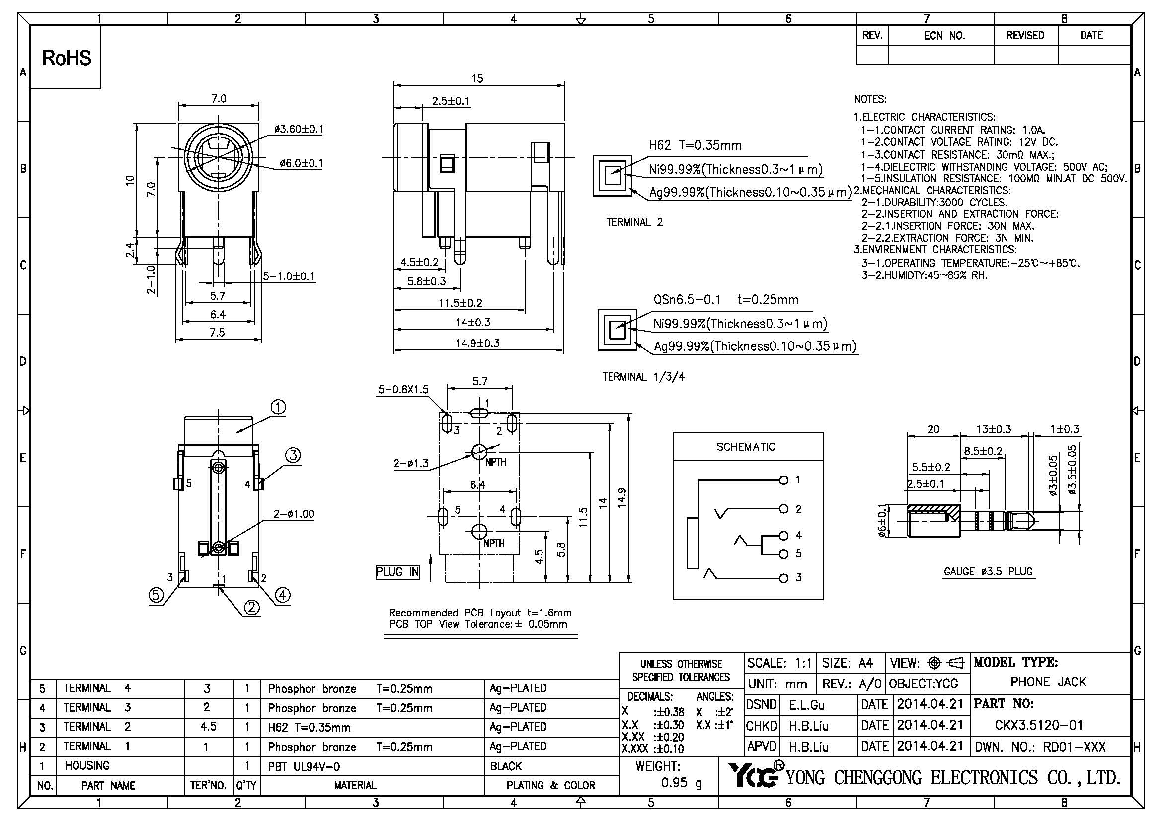 PHONE JACK φ3.6mm,R/D,CH7.0mm,4 Poles,BLACK