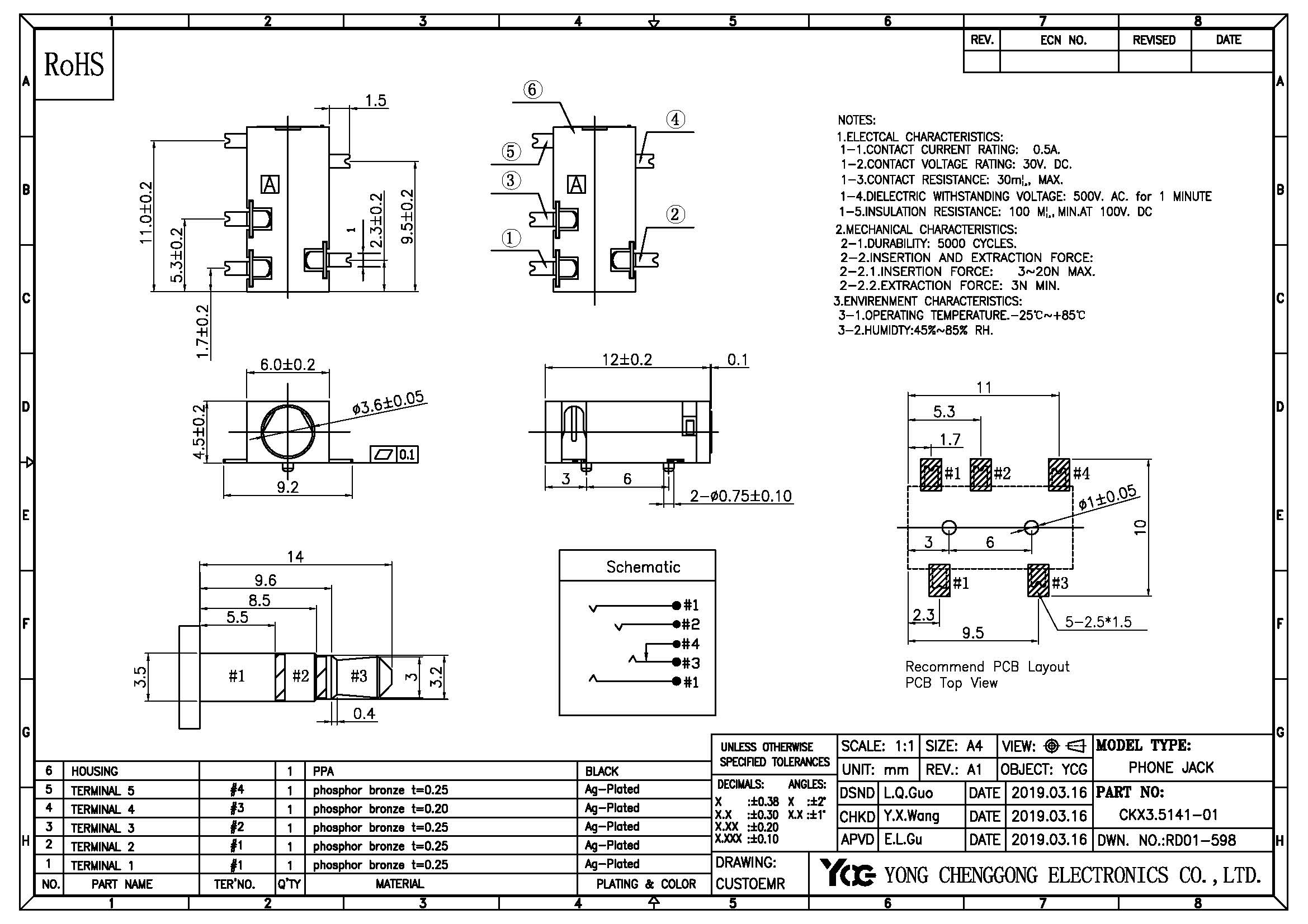 PHONE JACK φ3.6mm,R/S,CH2.0mm,3 Poles,BLACK