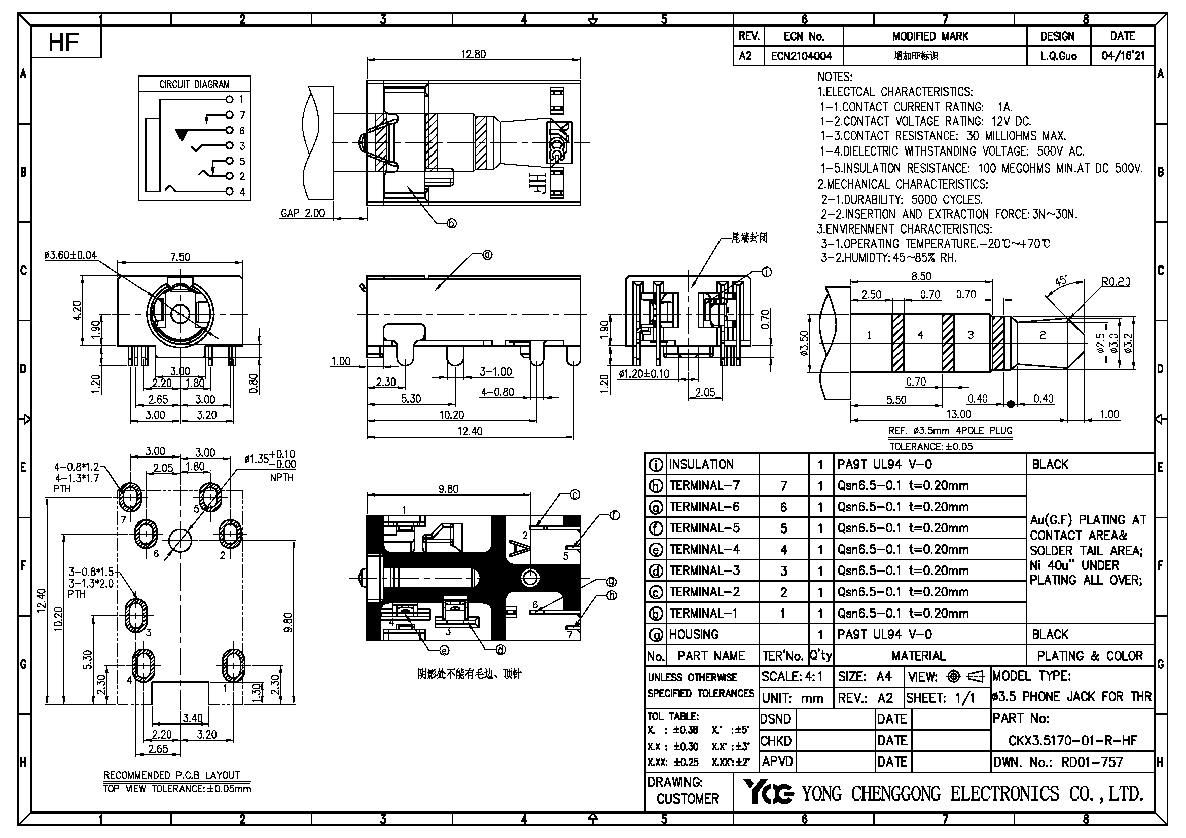 PHONE JACK φ3.6mm,R/S,4 Poles,BLACK