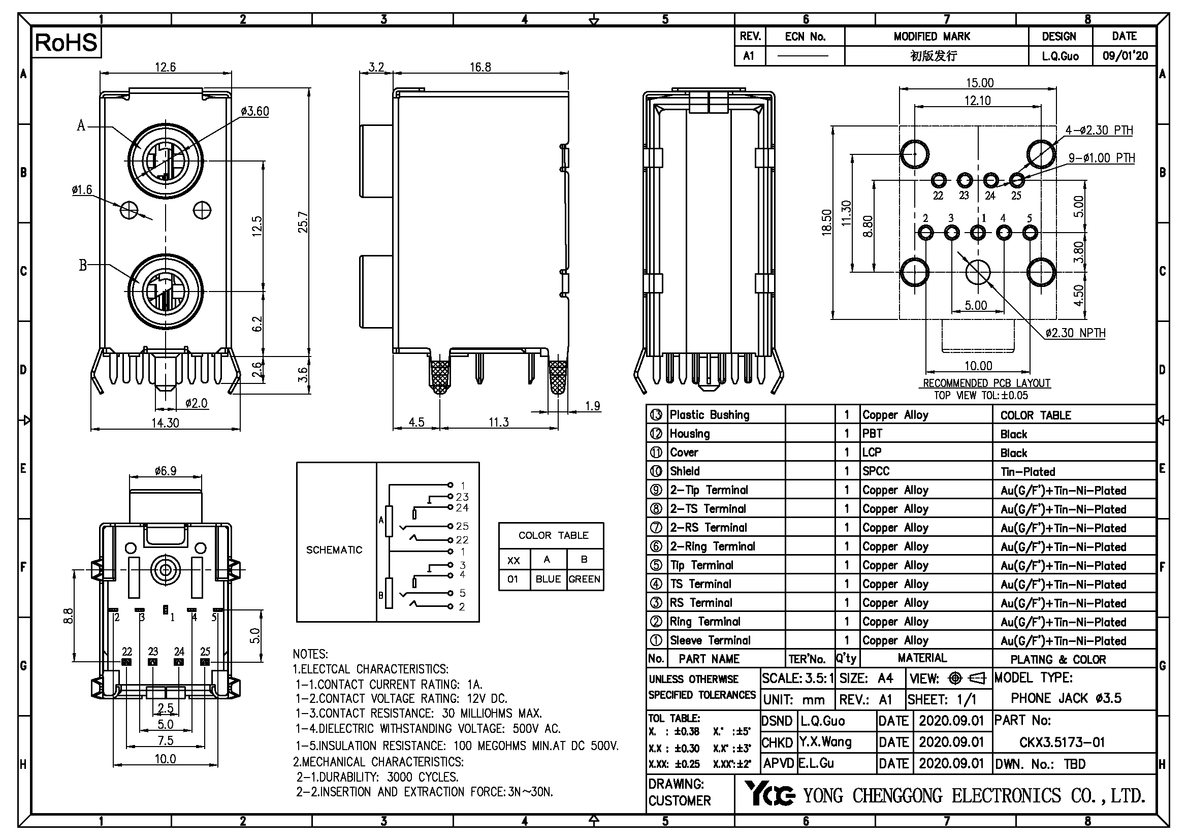 PHONE JACK φ3.6mm,R/S,4 Poles,BLACK