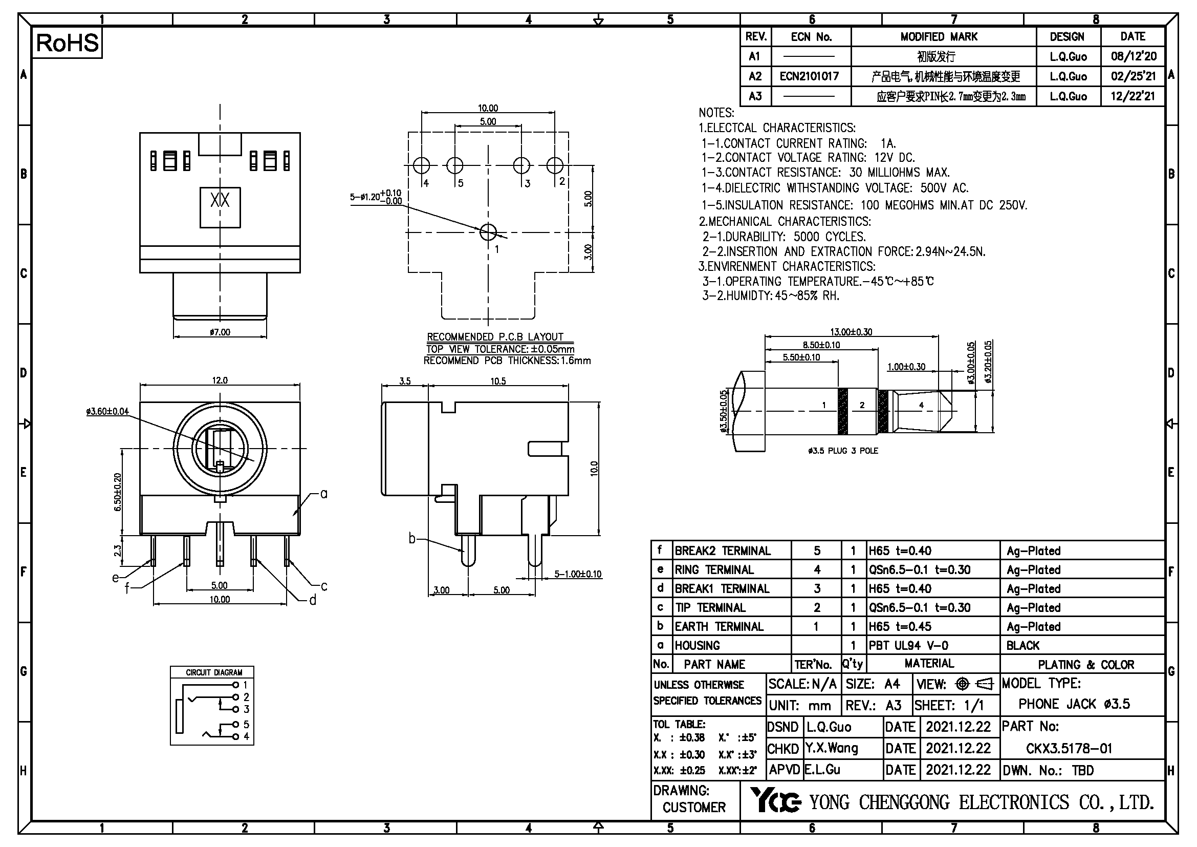 PHONE JACK φ3.6mm,R/S,3 Poles,BLACK