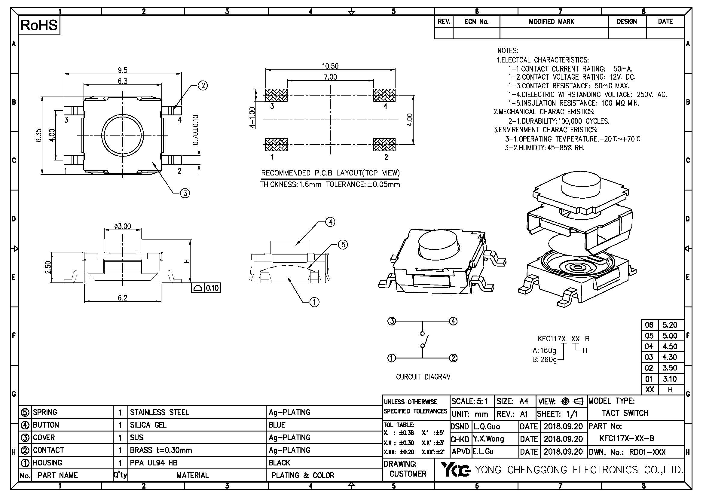 TACT SWITCH V/S,H3.1~H5.2,160gf/260gf±50gf,Silica gel button,Blue