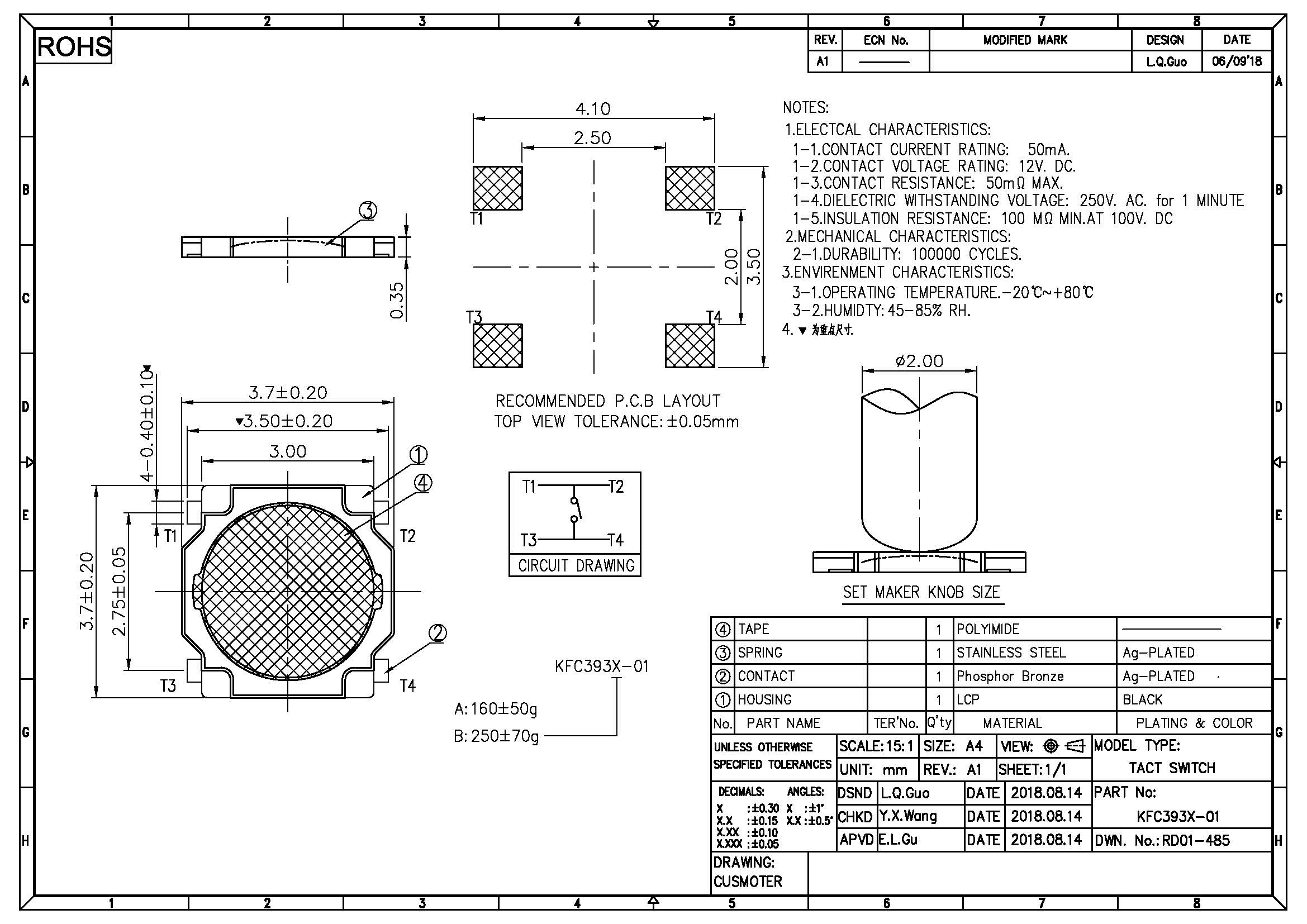 TACT SWITCH V/S,L3.7*W3.7*H0.35,160gf/250gf±50gf